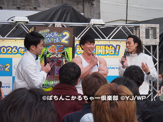 SANKYOは、2026年2月28日渋谷の道玄坂広場にて『eフィーバーダンベル何キロ持てる?2』導入直前記念イベントを開催し、多くの参加者が集まった。