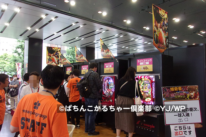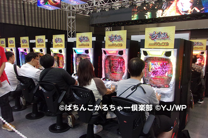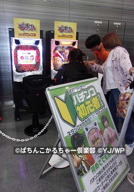 体験コーナーでは、ホール設置前の最新機種『e花の慶次~黄金の一撃』が試打できるコーナーをはじめ、慶次シリーズの実機を使った「一球入魂(手でスタートに一球を入れ、当れば豪華景品ゲット)」や2段階抽選の「スペシャルくじ」、パチスロのストップボタンがパンチングマシンのようになっているなど様々な未来型遊技機の提案を行う「あそびにマジメLab」、そして初心者に説明しながら体験してもらうコーナー等多数のコンテンツが用意され、それぞれ長蛇の列ができた。